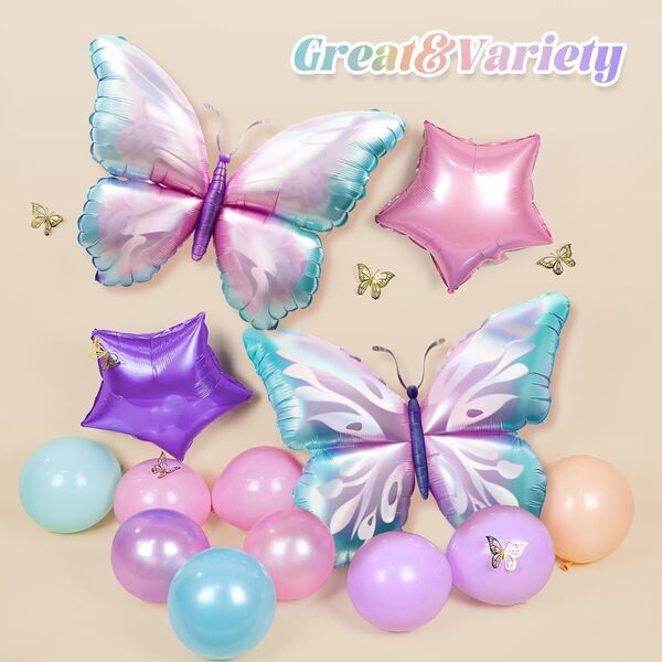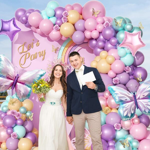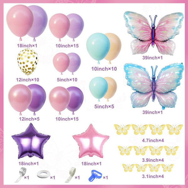 প্রজাপতি বেলুনের মালার কিটে মূলত ল্যাটেক্স বেলুন থাকে, এগুলি বিভিন্ন আকারে আসে (5 ইঞ্চি, 10 ইঞ্চি, 12 ইঞ্চি এবং 18 ইঞ্চি)। তাদের রঙ সাধারণত গোলাপী, নীল, বেগুনি, ইত্যাদি দ্বারা প্রাধান্য পায়। কিটের লেয়ারিং প্রভাব বাড়ানোর জন্য, আপনি স্বচ্ছ ল্যাটেক্স বেলুন এবং কনফেটি ল্যাটেক্স বেলুনও দেখতে পারেন। কিটের থিম হিসাবে, প্রজাপতি ফয়েল বেলুনগুলিও অপরিহার্য। তাদের বেশিরভাগ রঙ উজ্জ্বল (নীল/গোলাপী/বেগুনি...), এবং গড় আকার 18-30 ইঞ্চি (কাস্টম আকার উপলব্ধ সহ)। উপরন্তু, তাদের একটি খুব বাস্তববাদী চেহারা আছে যা প্রায় প্রাণবন্ত।