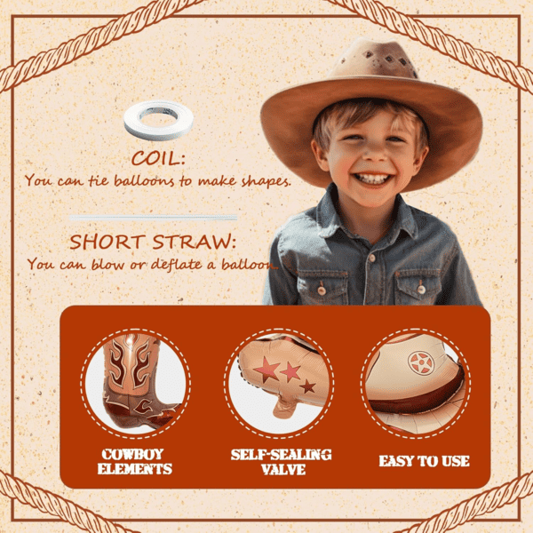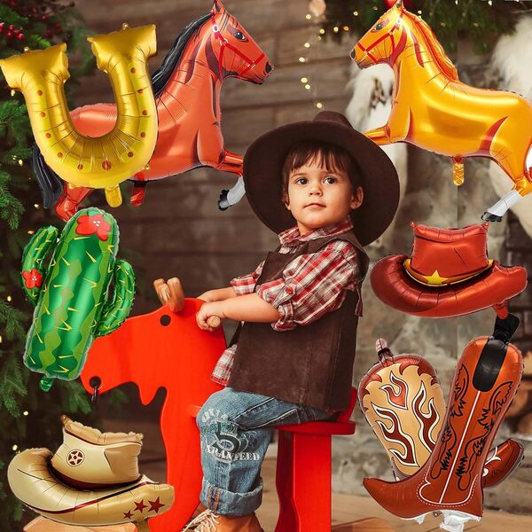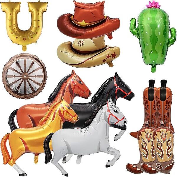 কাউবয় ফয়েল বেলুন মালা সেট:এই বেলুনের মালা সেটের মূল বৈশিষ্ট্য হল গলপিং ঘোড়ার ফয়েল বেলুন বাতাসে উড়ছে। আপনি এই প্রভাব তৈরি করতে ডট আঠালো এবং ফিতা দিয়ে তাদের ঠিক করতে পারেন। এছাড়াও, কাউবয় হ্যাট ফয়েল বেলুন এবং কাউবয় বুট ফয়েল বেলুন যোগ করুন একটি ভাল সমন্বয় হবে। সেটের মূল অংশটি পশ্চিমা-স্টাইলের ডিজাইনের ল্যাটেক্স বেলুন দিয়ে গঠিত। প্রায় 60-80pcs বিভিন্ন আকারের বেলুন রয়েছে, যার মধ্যে রয়েছে বাদামী, কালো এবং কালো এবং সাদা গরুর রঙের ইত্যাদি।