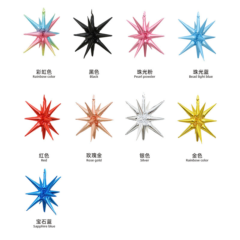এক-পিস বিস্ফোরক তারকা ফয়েল বেলুনগুলি: দুটি আকারে উপলব্ধ: 22 ইঞ্চি এবং 27 ইঞ্চি। 22 ইঞ্চি আকারটি ছোট এবং শয়নকক্ষ এবং অফিসগুলির জন্য উপযুক্ত, এটি জন্মদিনের সজ্জার জন্য উপযুক্ত করে তোলে। 27 ইঞ্চি আকারটি বড় জায়গা যেমন বনভোজন হল এবং শপিংমল উইন্ডোগুলির জন্য আরও উপযুক্ত। এমনকি যদি এটি উচ্চ ঝুলানো হয় তবে প্যাটার্নটি পরিষ্কারভাবে দেখা যায়।
