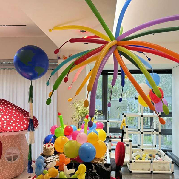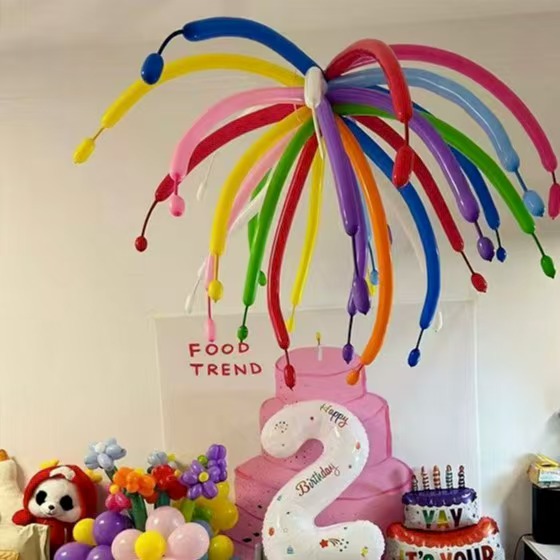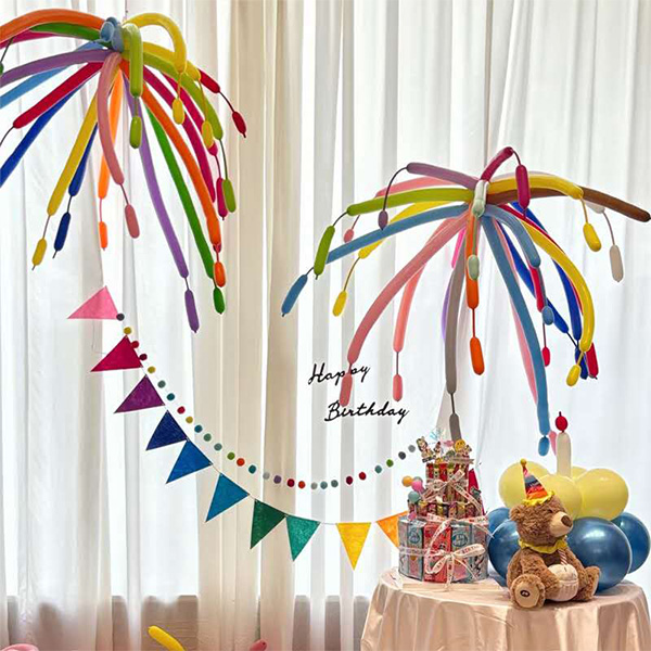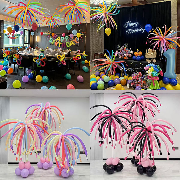 আকৃতি ডিজাইনের জন্য। অনুপ্রেরণাটি রাতের আকাশে আতশবাজি ফেটে থেকে আসে। এগুলি উজ্জ্বল, গতিশীল এবং আকর্ষণীয়। এটি ফেটে যাওয়ার সময় আতশবাজিগুলির আকারটি পুরোপুরি অনুলিপি করে। লম্বা বেলুন স্ট্রিপগুলি প্রসারিত এবং কেন্দ্র থেকে ছড়িয়ে পড়ে। ছোট বেলুনগুলি প্রান্তে যুক্ত করা হয়। তারা বিস্ফোরিত আতশবাজি থেকে স্পার্কসের মতো দেখায়। জীবনকাল এবং প্রাণবন্ত। পার্টি সিলিংয়ে তাদের ঝুলিয়ে দিন। বা এগুলি আলংকারিক স্তম্ভ হিসাবে মাটিতে রাখুন। তারা তাত্ক্ষণিকভাবে ফেটে আতশবাজিগুলির একটি সুন্দর ভিজ্যুয়াল এফেক্ট তৈরি করে। পার্টির অতিথিরা মনে করবেন তারা আতশবাজি শোতে আছেন। একটি সুখী এবং প্রাণবন্ত পরিবেশে নিমগ্ন। এছাড়াও, নীচে বেলুন বেসটি ভালভাবে ডিজাইন করা হয়েছে। বিভিন্ন রঙের ম্যাচ সহ ফায়ারওয়ার্ক-আকৃতির বেলুনগুলি। তাদের ঘাঁটিগুলি মেলুন বেলুন সংমিশ্রণগুলি ব্যবহার করে। বেসটি বেলুনটি স্থিতিশীল রাখে। এটি সামগ্রিক আলংকারিক সৌন্দর্যও বাড়ায়। পুরো আতশবাজি-আকৃতির বেলুনটি উপরে থেকে নীচে একীভূত করে তোলে। পার্টিতে একটি সুন্দর দৃশ্যে পরিণত হয়।