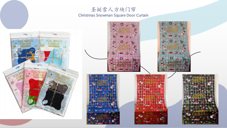যেমন ক্রিসমাস-থিমযুক্ত সবুজ এবং লাল ফয়েল কার্টেন, হ্যালোইন-থিমযুক্ত কালো এবং কমলা ফয়েল পর্দা এবং কুমড়ো, বাদুড়, মাকড়সা এবং অন্যান্য আকারগুলির সাথে ফয়েল পর্দা, যা ঘর, শপিং মল, বার এবং অন্যান্য জায়গায় ছুটির সাজসজ্জার জন্য ব্যবহার করা যেতে পারে।