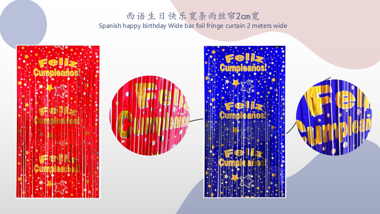 শক্ত রঙ, লেজার রঙ, ম্যাকারুন রঙ ইত্যাদি সহ rich সমৃদ্ধ এবং বিভিন্ন রঙ এবং কিছু ফয়েল পর্দার চকচকে এবং ধীরে ধীরে পরিবর্তনের প্রভাব রয়েছে এবং এটি পাঁচটি তারা, পীচ হার্টস ইত্যাদির মতো বিভিন্ন আকারে ডিজাইন করা যেতে পারে যা দৃশ্যে হাইলাইটগুলি যুক্ত করতে পারে এবং একটি অনন্য পরিবেশ তৈরি করতে পারে।