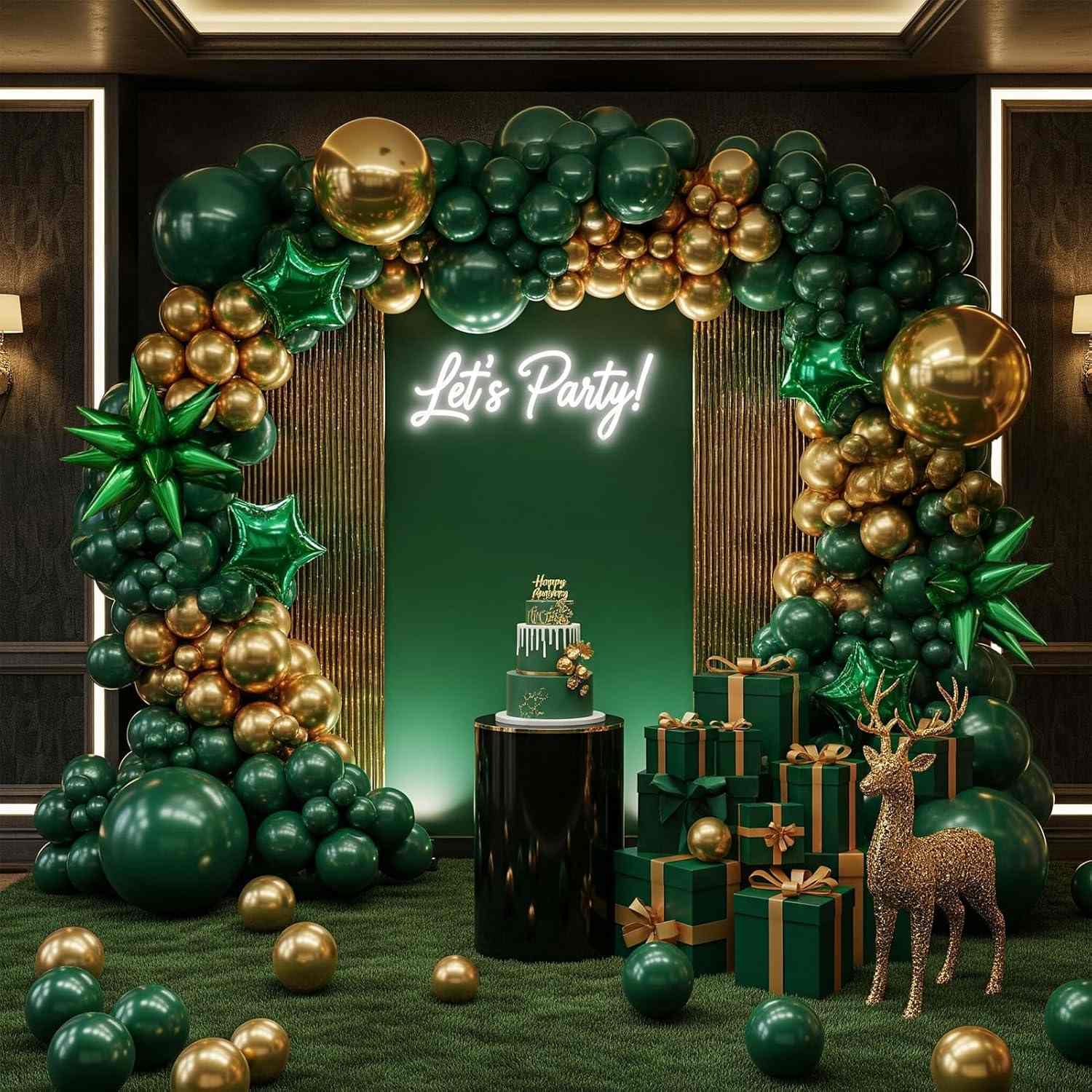 সবুজ এবং সোনার পার্টি বেলুন খিলান যে কোনও দৃশ্যের মূল দৃশ্য হতে পারে। এটি জমিন এবং অনুষ্ঠানের একটি শক্তিশালী অনুভূতি যোগ করে। এটি করুণা এবং একটি বিশেষ স্বাদ উভয় দেখায়।