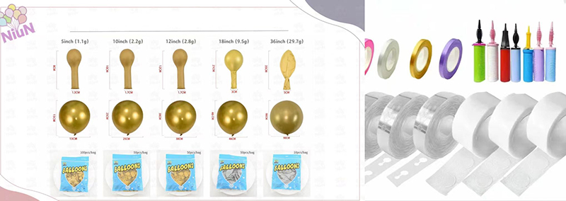 খিলান সেটে 5-ইঞ্চি, 10-ইঞ্চি, 12-ইঞ্চি, 18-ইঞ্চি বা 36-ইঞ্চি বেলুন রয়েছে। এই বিভিন্ন আকারের সমন্বয় আপনাকে একটি সম্পূর্ণ এবং স্তরযুক্ত চেহারা সহ একটি বেলুন খিলান তৈরি করতে দেয়।