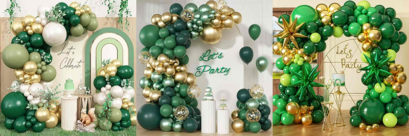 যখন ম্যাট সবুজ, গাঢ় সবুজ, এবং অন্যান্য সবুজ বেলুন সোনার সাথে মিশে যায়, তখন সবুজের বিভিন্ন ছায়াগুলি খিলানে বন্দী বনের জীবন এবং পুরানো দিনের কমনীয়তার মতো মনে হয়। সোনা সূর্যালোকের মতো জ্বলজ্বল করে, পুরো রঙকে উজ্জ্বল করে তোলে। পরিবর্তিত সবুজ খিলানকে সজীব রাখে এবং ধাতব সোনা সবুজের ভারীতাকে নরম করে। ফলাফলটি প্রাকৃতিক, সমৃদ্ধ এবং অভিনব মনে হয়, অনেক বিপরীতমুখী পার্টি দৃশ্যের সাথে মানানসই।