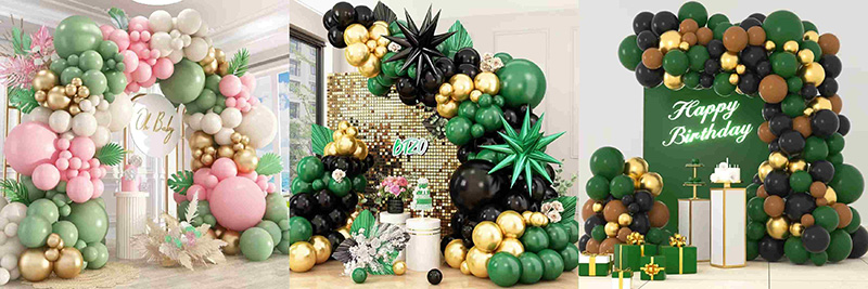 আপনি সবুজ এবং সোনার বেলুন আর্চ সহ সাদা বা নাশপাতি সাদা রঙের বেলুন ব্যবহার করতে পারেন। এটি নরম এবং উষ্ণ হয়ে উঠবে এবং একটি বসন্ত বাগানের সতেজতা ক্যাপচার করার মতো হবে; গোলাপী রঙের বেলুনগুলির সাথে পেয়ার করা হলে, এটি একটি প্রাণবন্ত অনুভূতি তৈরি করতে পারে যা ক্লোয়িং ছাড়াই মিষ্টি, শিশুর ঝরনা এবং মেয়ে-থিমযুক্ত পার্টিগুলিতে একটি রোমান্টিক পরিবেশের অনুপ্রবেশ ঘটায়; এমনকি কালো এবং বাদামীর মতো গভীর রঙের সাথে মিলিত হলেও, সবুজ এবং সোনার রঙগুলি তার আকর্ষণীয় রঙের টান দিয়ে সেই রঙগুলির গভীরতা এবং স্থায়িত্বকে ভারসাম্য দিতে পারে, একটি আধুনিক অথচ উষ্ণ উদযাপনের পরিবেশ তৈরি করে।