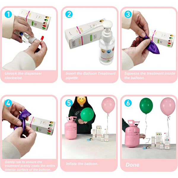 সাধারণত, হিলিয়াম বেলুন প্রটেক্টরের একটি 100 মিলি বোতল 10 ইঞ্চি বা 12 ইঞ্চি ল্যাটেক্স বেলুনগুলির 65-70 টুকরা ব্যবহার করতে পারে।