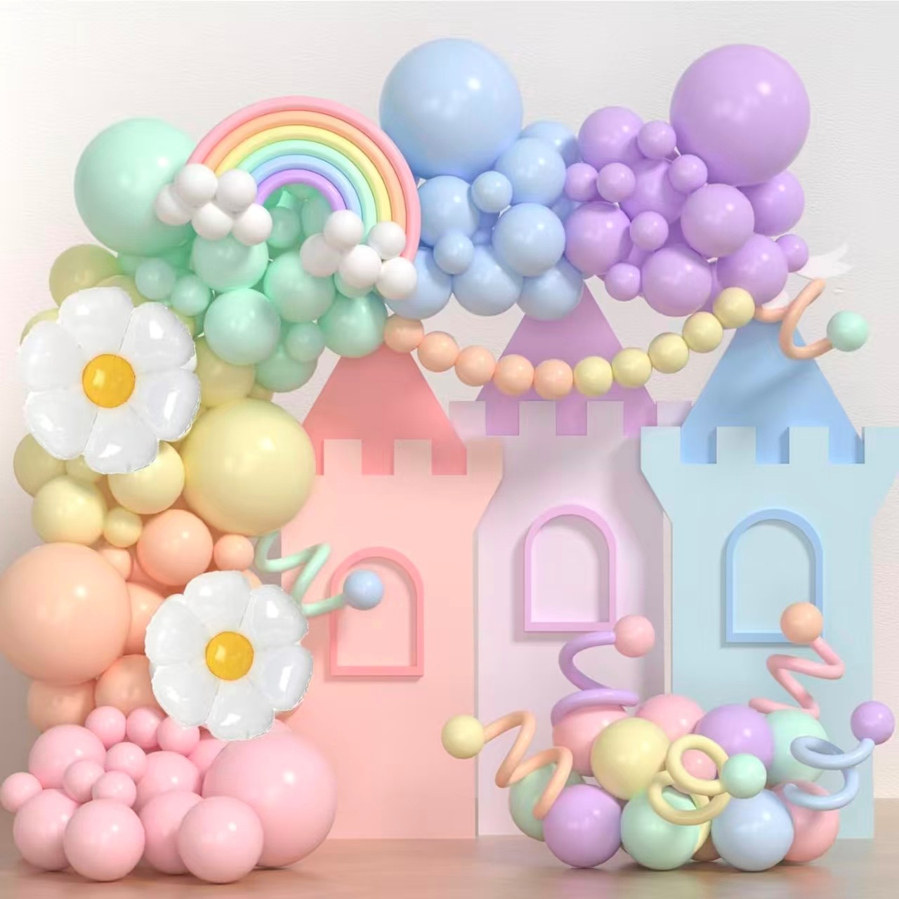 নরম গোলাপী এবং হালকা নীল রঙগুলি একটি রোমান্টিক এবং উষ্ণ অনুভূতি তৈরি করে। বিবাহের ম্যাকারুন বেলুনগুলি গারল্যান্ড আর্চ প্রায়শই স্বাগত অঞ্চল, ব্রত ব্যাকড্রপ বা ফটো স্পটে সেট আপ করা হয়। অতিথিরা এখানে ছবি তুলতে পছন্দ করেন।