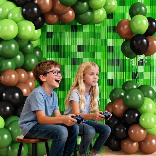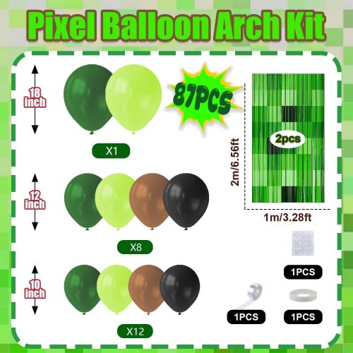 এই জন্মদিনের মাইনক্রাফ্ট বেলুন আর্চ কিটটি ম্যাট গাঢ় সবুজ, ম্যাট আপেল সবুজ, ম্যাট কালো এবং ম্যাট বাদামী দ্বারা আচ্ছাদিত। এতে 10 ইঞ্চি বেলুন, 12 ইঞ্চি বেলুন এবং 18 ইঞ্চি বেলুন রয়েছে।
